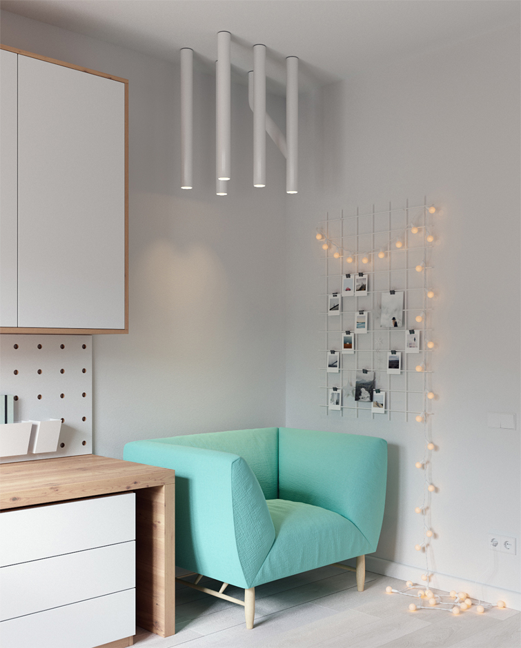 In the center of the room there is a functional zoning volume, a white cube, dividing the entire living room into 5 zones: active pastime area, TV area, dressing area, secluded relaxation area and the central area – relaxation area, located inside the white volume.